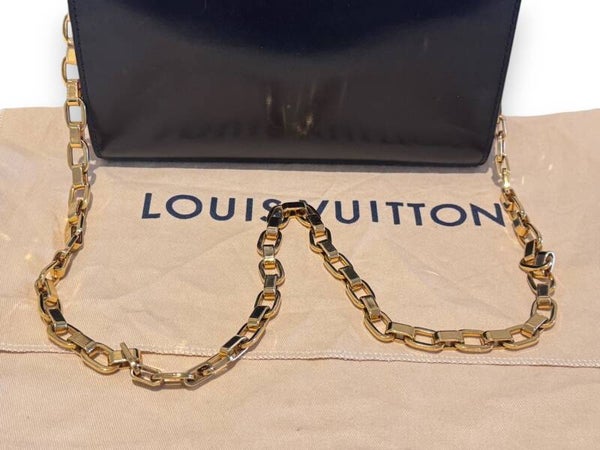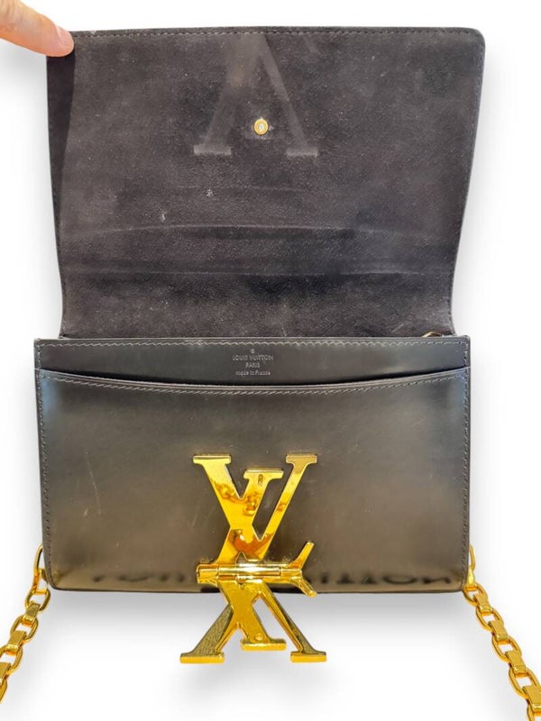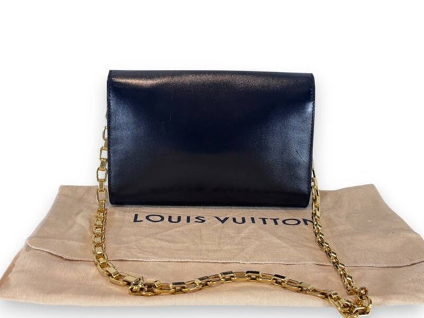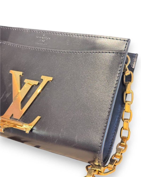 Kaunis elegantti nahkainen Pochette esimerkiksi iltajuhla-laukuksi. Juhlava kultaketju olkahihnana. Kaunis kiiltävä nahka, iso kultainen LV lukitus kääntyvälle kannelle.