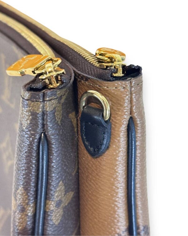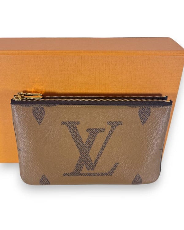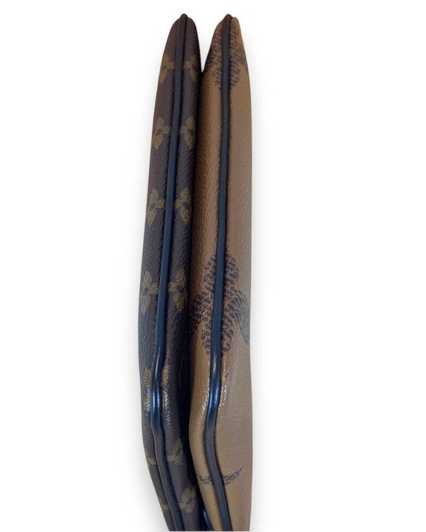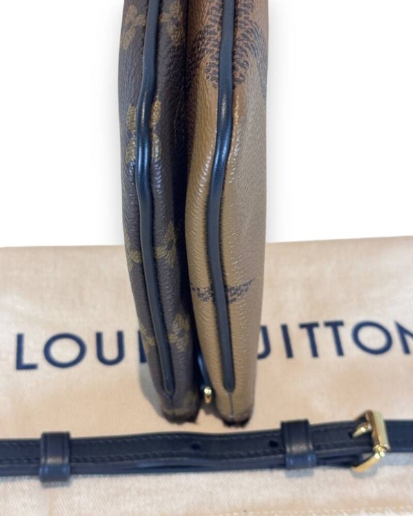 Upea sirutettu kahdella vetoketjutaskulla oleva yliolan laukku. Toisella puolella perinteinen Monogram canvas ja toisella puolell Giant Reverse Monogram canvas. Hihna irroitettava jolloin toimii myös clutchina. Toisen puolen sisällä myös paikat kolmelle kortille.