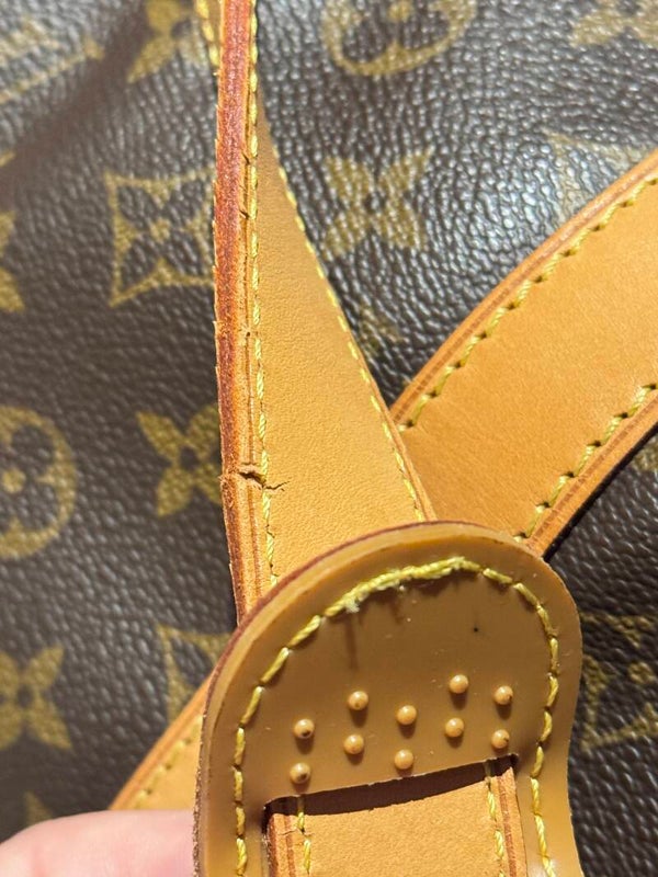 Valmistettu kestävästä Monogram Canvas -materiaalista ja viimeistelty luonnollisella vachetta-nahalla, joka on patinoitunut kauniisti lämpimän hunajan sävyyn. Mukana säädettävä ja irrotettava olkahihna, jossa pieni halkeama ja ommelvaurio yhdessä kohdassa (näkyy kuvissa, ei vaikuta käytettävyyteen).