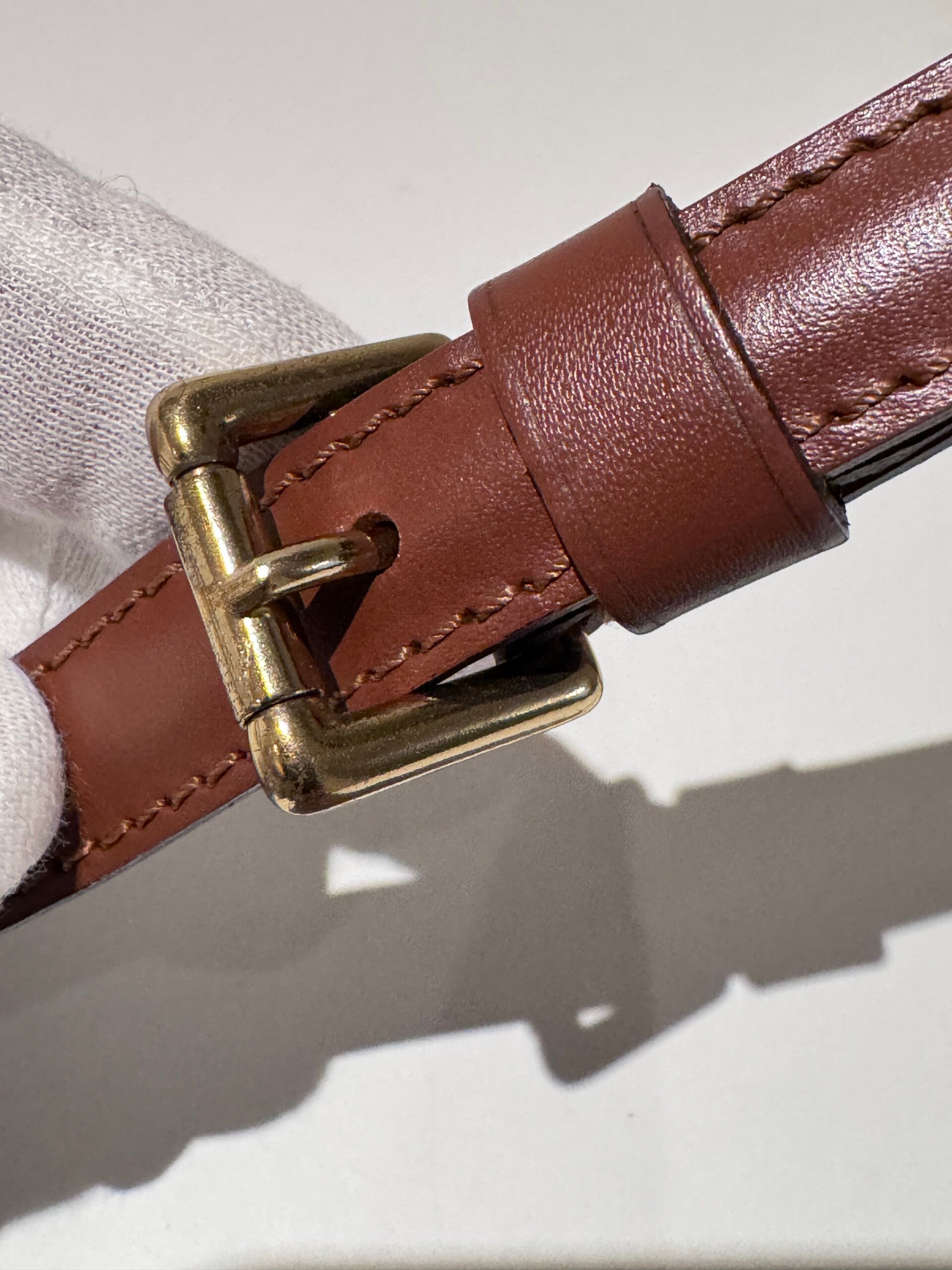 Klassinen Louis Vuitton -olkahihna, valmistettu nahasta ja viimeistelty kullanvärisillä metalliosilla. Tämä hihna sopii täydellisesti Louis Vuittonin laukkujen kanssa — esimerkiksi Pochette Accessoires, Alma, Speedy tai Félicie -malleihin.